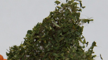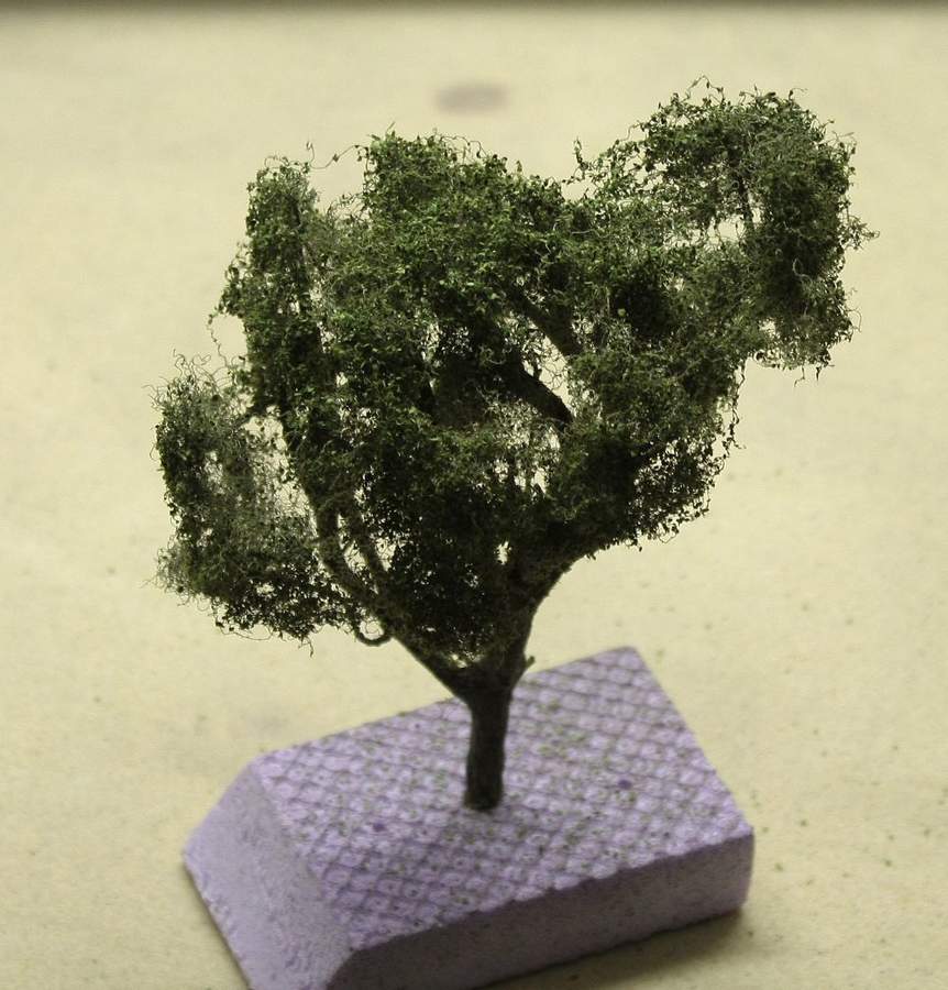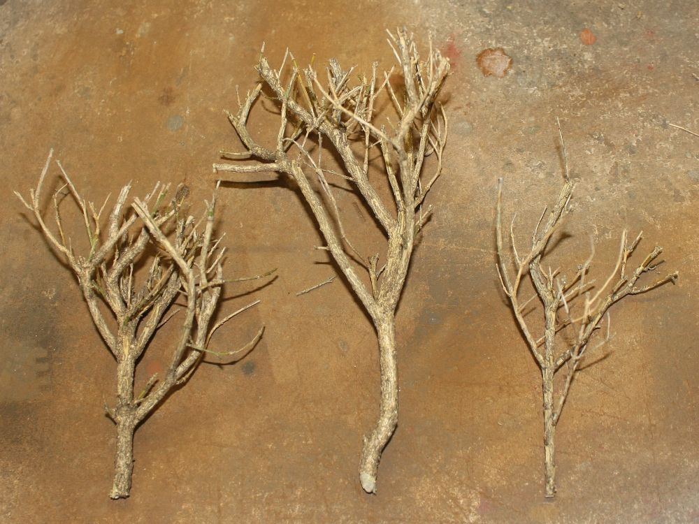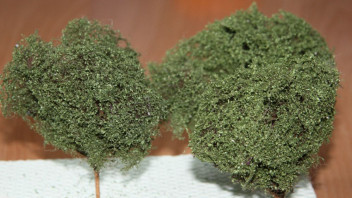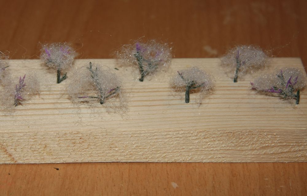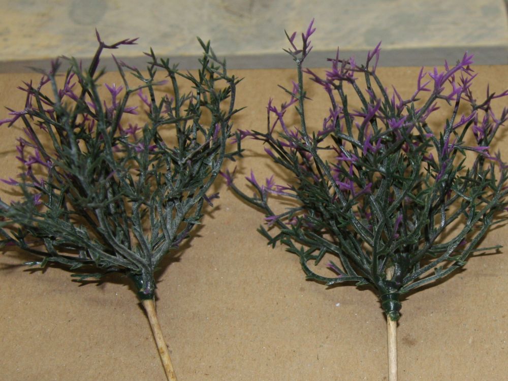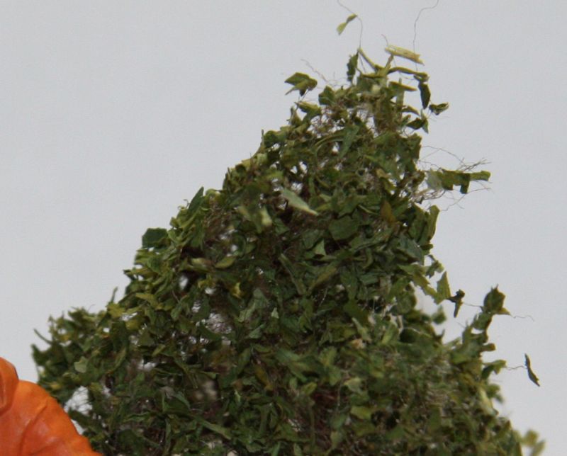 Nochmal zurück zu den Büschen. Die Teile aus der Lavendelkugel sind ziemlich flach. Auf den Bildern fällt das nicht so auf, aber die Büsche haben nur wenig Voumen. Also hab ich mal drei solche Teile auf einen Zahnstocher gefädelt und verklebt.