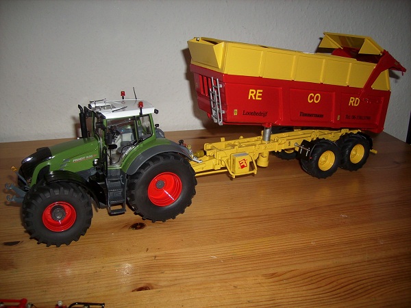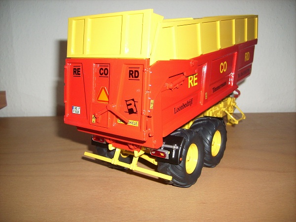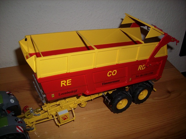 Hallo. Habe meinen Record Maiskipper (Fabrikat aus Belgien, welches früher zu Clayson gehörte...deshalb auch die Farben) fertig gestellt. Als Basis diente der Joskin 3-Achskipper von Ros. Der Kipper wurde komplett demontiert. Die 3. Achse (vorne) wurde entfernt. Der Maisaufsatz ist aus Poly. Bei Joskin gibt es nur eine Strebe auf der Wannenseite hinten über der Achse. Es wurde auf den Seiten der Wanne die 2. vordere Strebe aus Poly angefertigt. Das Chassis, die Felgen und der Aufsatz wurden in Clayson gelb lackiert. Die Wanne in Clayson rot. Es wurden die Reifen vom John Deere Harvester auf die Ros Felgen aufgezogen. Die Mäntel passen da super drauf. Er erhielt hinten links unter der Wanne eine Rundumleuchte und oben am Maisaufbau eine Arbeitsleuchte. Komplettiert durch Aufkleber und Nummernschild ist es im Moment mein Nr. 1 Abfuhrfahrzeug.