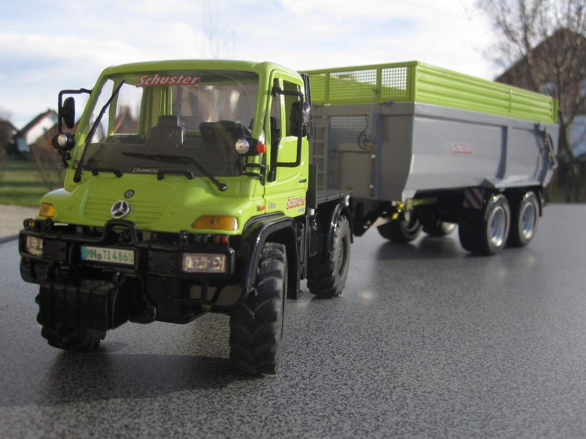 Zur Grabmeier-Mulde gibt es jetzt noch das passende Zugfahrzeug. Als Basis diente mit der Unimog von Welly. Dem habe ich eine Lenkung eingebaut und durch verschiedene Modifikationen dem Original angepasst.Das Originalgespann: