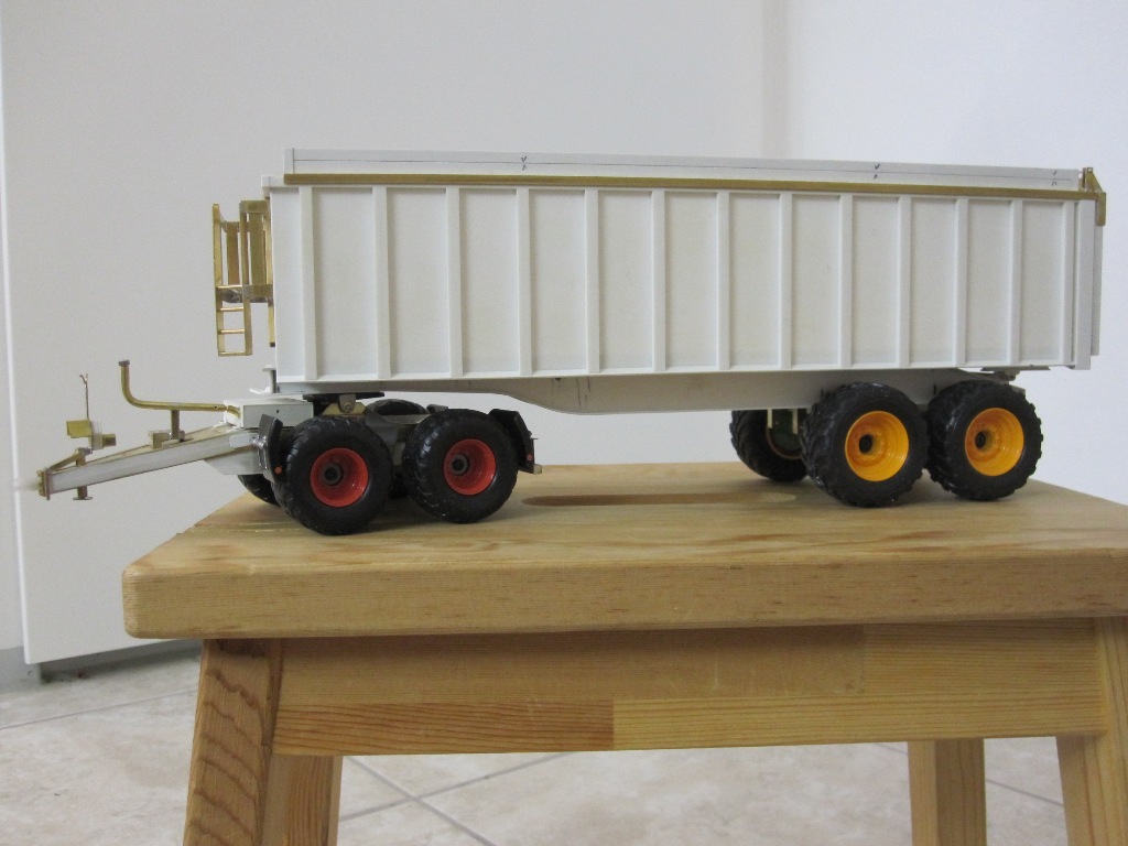 Es geht zwar zäh, aber immer hin voran. Die Mulde ist inzwischen auf dem Rahmen befestigt und der komplette Auflieger steht mittlerweile auch schon auf den Rädern. Ich denke, so langsam ist die Ähnlichkeit mit dem Original zu erkennen.