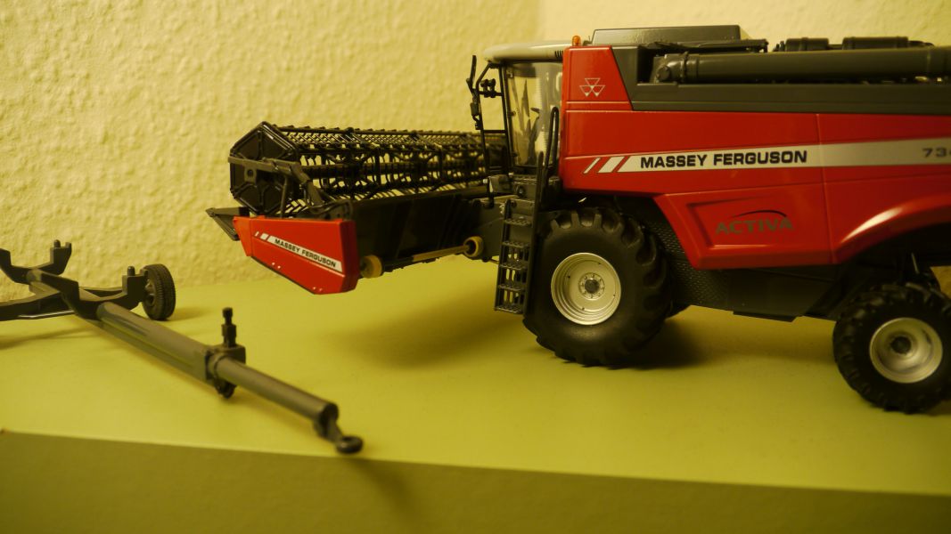 Eine Zapfwelle liegt bei, der Drescher hält das schneidwerk locker oben, man muss es mit Kraft und einem Finger auf dem Heck gradezu runter drücken...