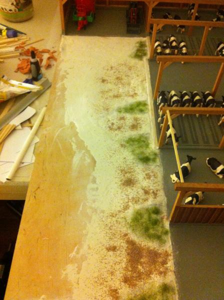 Leider hab ich die letzten paar Tage nicht viel Zeit gehabt mich weiterhin den Gittern zu widmen weil ich geschäftlich unterwegs war. Ich konnte aber ein bisschen am Vorplatz arbeiten. Der "Knetton" ist getrocknet. Sieht wenn man ihn auseinanderbricht etwas aus wie Papierlagen. Ich habe noch etwas mit Acrylspachtel nachgearbeitet und geschliffen. Auf dem folgenden Bild ist nur mal etwas Streumaterial lose drüber geworfen, um schonmal einen kleinen Eindruck zu bekommen wie die "Fahrspuren" und der ganze Vorplatz verlaufen soll. Wird nochmals abgesaugt und richtig gemacht;)