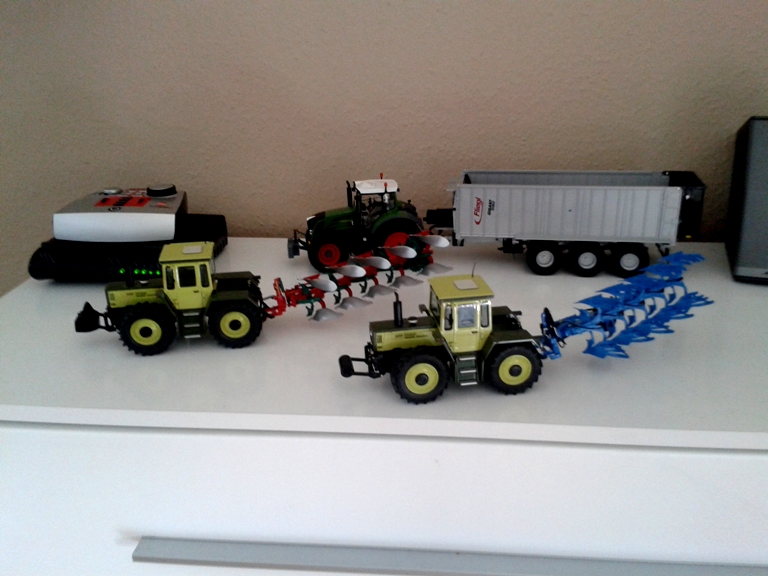 wie Ihr gleich sehen werdet bin ich in 1:1 und in 1:32 ein großer Trac Fan. Ich sammel grundsätzlich Modelle von Herstellern die wir auch in der 1:1 Landwirtschaft im Einsatz haben also MB trac, Unimog, Deutz und Case IH. Schlüter, JCB und Xerion sind ja ebenfalls Trac's und passen somit sehr gut in meine Sammlung. Einige Modelle hab ich selber umgebaut , einige aber auch schon umgebaut gekauft. Leider steht bei mir ein Umzug an so dass ich von den Bildern (Qualität....) und den Modellen nicht ganz auf dem aktuellen Stand bin. Freu mich auf eure Kommentare.