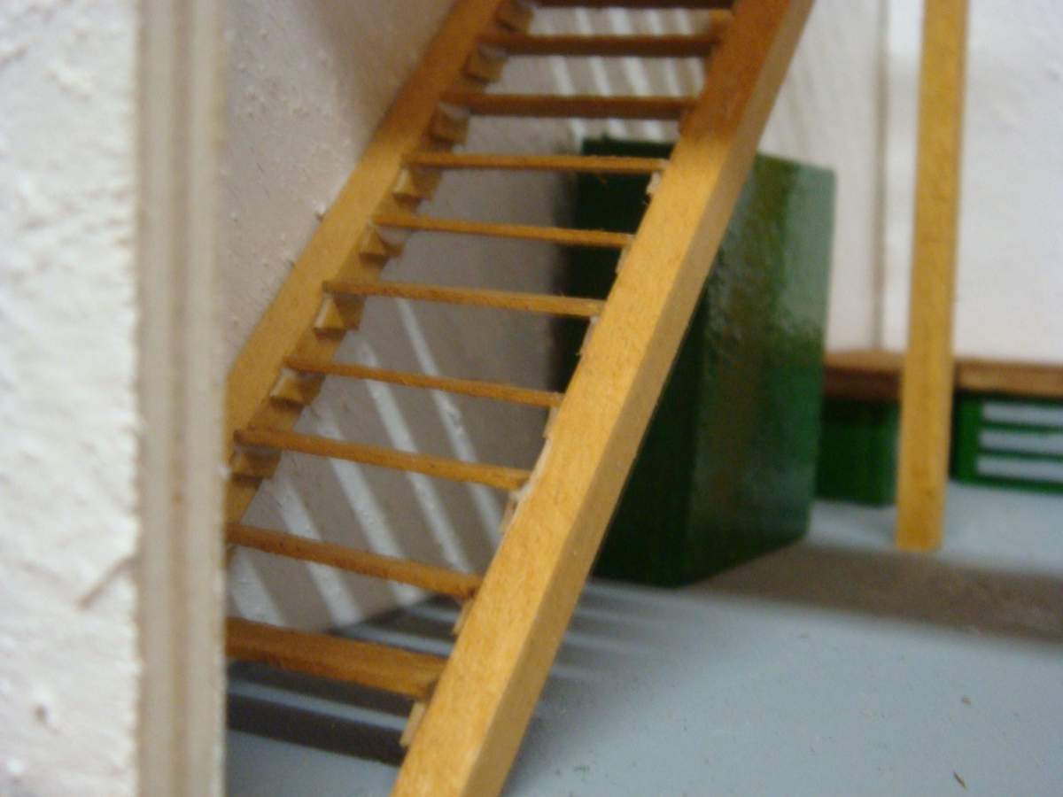 Ja ich muß euch recht geben, die Treppenwangen sind ein bißchen zu dick, aber leider habe ich sie schon reingeklebt. Habe es aber jetzt so gemacht, dass ich das Treppengeländer draufgeklebt habe. Dadurch wirkt es nicht mehr so stark!