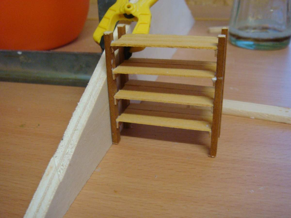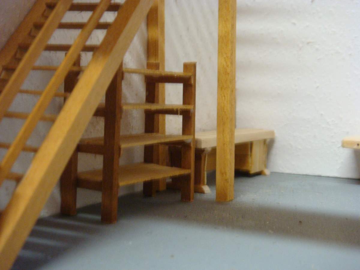 Was die Werkbank angeht kann ich meinen Vorrednern nur zustimmen. Ähnliches gilt für die Treppe: Die Treppenwangen wirken zu massiv, auch finde ich den quadratischen Querschnitt für die Treppenwangen unpassend. Bei dem einen Bild mit dem Boden des Obergeschosses sieht es so aus, als wenn der Treppe die letzte Stufe fehlt.. kann aber auch täuschen.