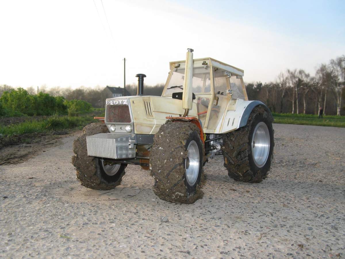 Ich möchte euch mal ein paar meiner bisher gebauten Modelle vorstellen.Den Anfang macht mein Deutz DX 7.10,den ich von einem anderen Modellbauer erwerben konnte und der von mir umgebaut wurde.Die Reifen und Felgen wurden erneuert,die Vorderachse umgebaut und der komplette Antriebsstrang umgerüstet. Nun läuft er zu meiner Zufriedenheit und ich kann mit den weiteren Details,wie Heckkraftheber und Innenausbau beginnen.