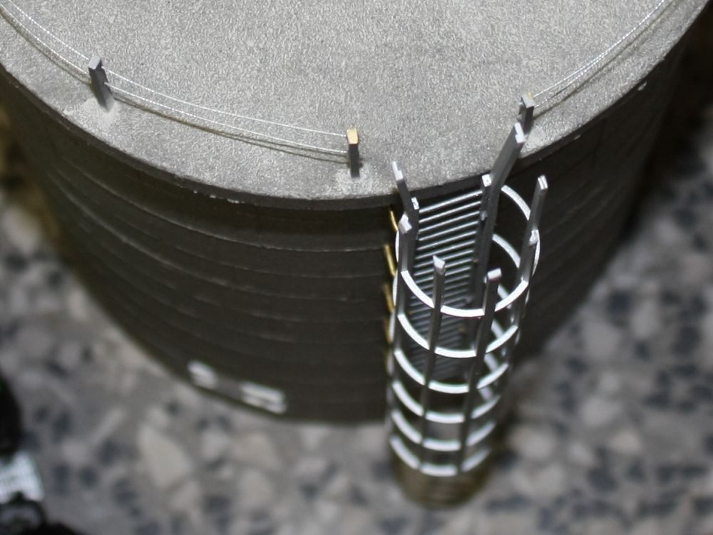 Dann hab ich die Leiter mit Abstand zur Wand befestigt. Den Fallschutz musste ich oben kürzen und aufweiten, da fehlt noch ein umlaufendes Abschlussprofil.
