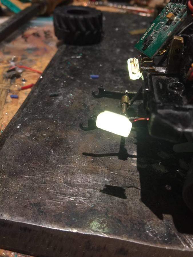 Das Akkufach habe ich aus Messing gelötet genau wie die Aufnahme der FH. Die Lampen habe ich aus Plexiglas gefeilt.