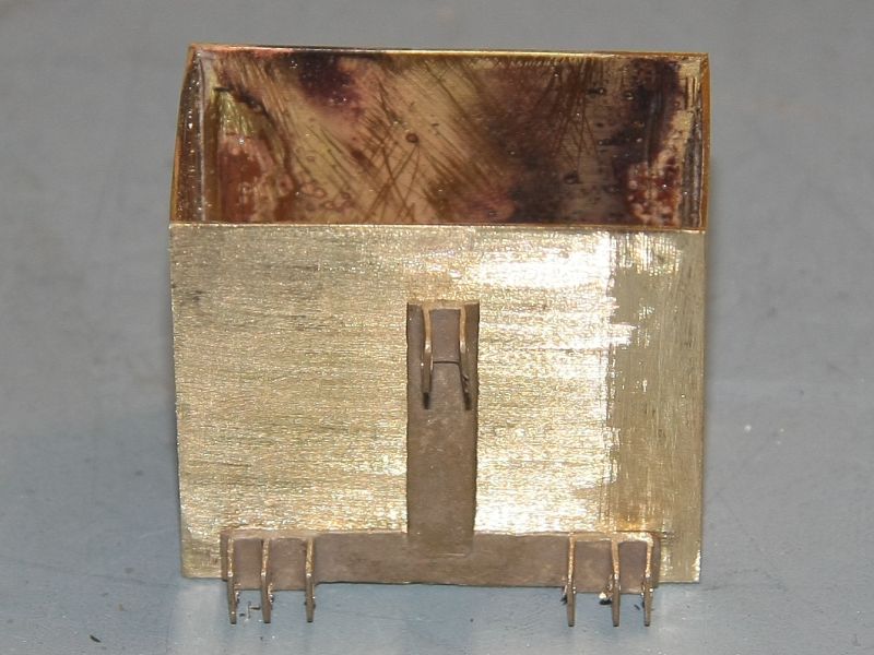 Zunächst wurden die Teile für den Blechmantel aus 0,5mnm MS Blech ausgesägt. Den Kasten habe ich hart gelötet, damit ich beim Löten der weiteren Teile nicht so aufpassen muss, dass er nicht wieder auseinander fällt. Für die Dreipunktaufhängung und das Zugmaul habe ich die beiden Gussteile passend zurechtgeschliffen.