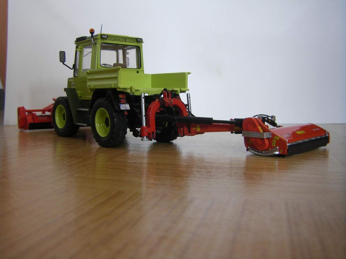 Auch das Mulchgerät hast du hervorragend aufgewertet, aber hier fehlt noch der waagerechte Zylinder, um es seitlich verschieben zu können. Vor einiger Zeit habe ich einen ähnlichen Umbau gemacht und auch den Zylinder nachgerüstet (http://agrarmodellbau.de/showthread.php…t#post347813%22">LINK). Vielleicht hilft dir das, das Mulchgerät noch näher an das Original heranzubringen.
