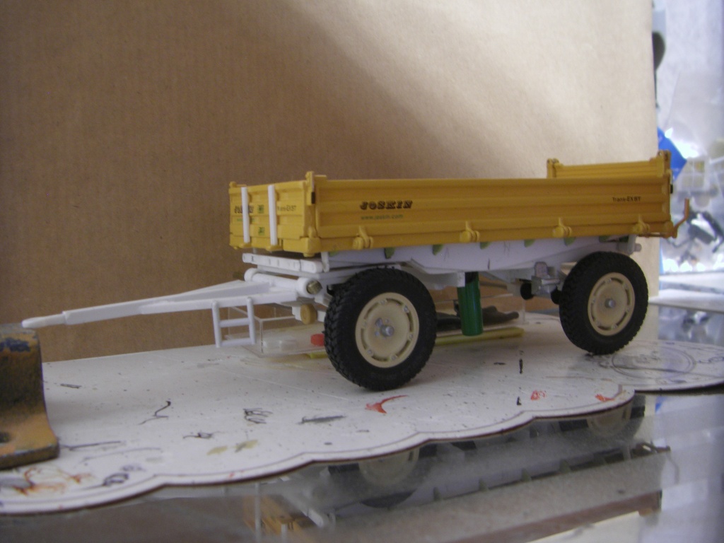 Ich hoffe, dass ich mit der Pritschengröße hinkomme. Der KDU 7200 sollte ca. 2x4m haben, was umgerechnet ungefähr dem Joskin Trans EX 5T in 1:32 entspricht. Wenn ich ihn zu einem Traktor hinstelle kommt er mir etwas zu klein vor. Vor einem Unimog siehts besser aus.