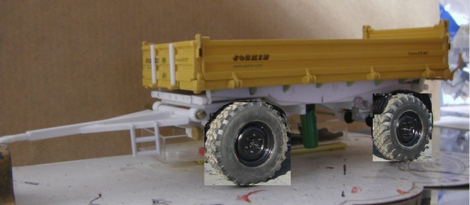 Ich hoffe, dass ich mit der Pritschengröße hinkomme. Der KDU 7200 sollte ca. 2x4m haben, was umgerechnet ungefähr dem Joskin Trans EX 5T in 1:32 entspricht. Wenn ich ihn zu einem Traktor hinstelle kommt er mir etwas zu klein vor. Vor einem Unimog siehts besser aus.