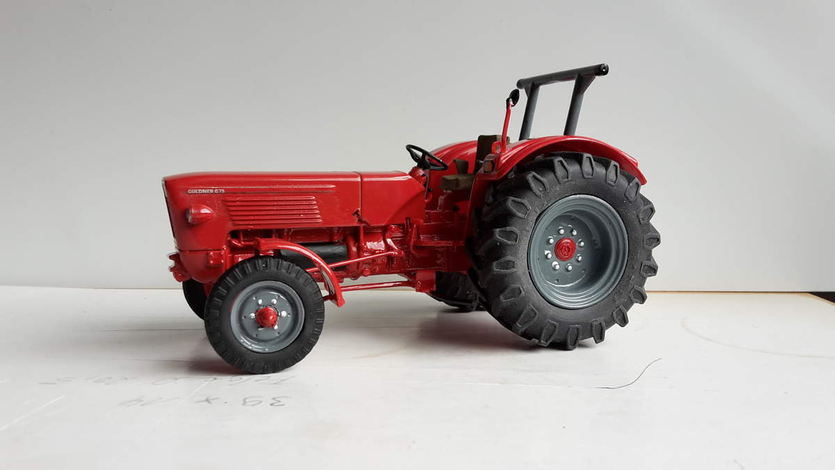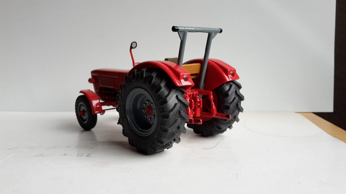 So bekommt er jetzt ein modifiziertes Verdeck vom Atlas Wotan und die Vorderräder vom Eicher 780 von Agrarmodell Exclusiv. Die Nabe ist Eigenbau.