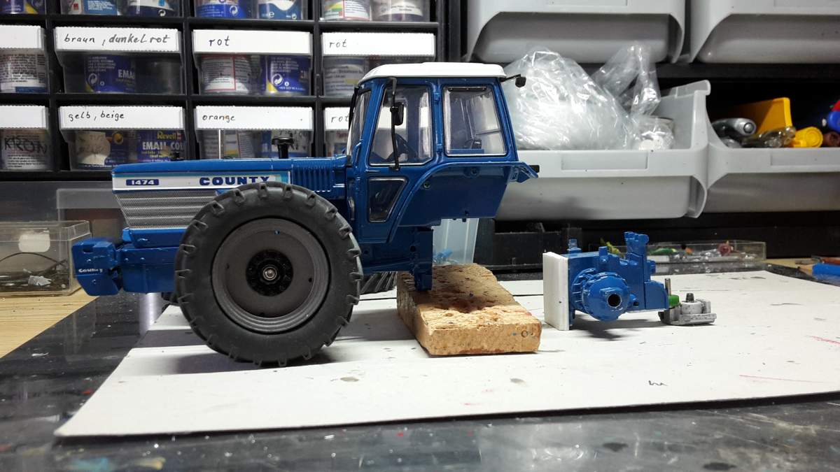 Habe einen defekten Ford TW35 Gen.I von UH bekommen. Es wurde bereits ein FKH eines Ford implantiert. Der Radstand stimmt sowieso nicht, so dass ich gleich die Hinterachse rausgeschnitten habe und sie ein paar Milimeter nach hinten setzen werde um auch die dicken Pellen unterzubringen. Das Heckhubwerk hat Spielzeugcharakter und fliegt raus. Ein Kraftheber von einem Weise Fendt 515 soll das Ganze komplettieren. Felgen von verschiedenen Weise Fendts mit Verbreiterung und ein paar passende Pellen drauf. Den krieg ich schon hin.