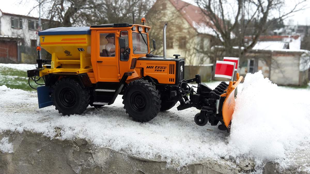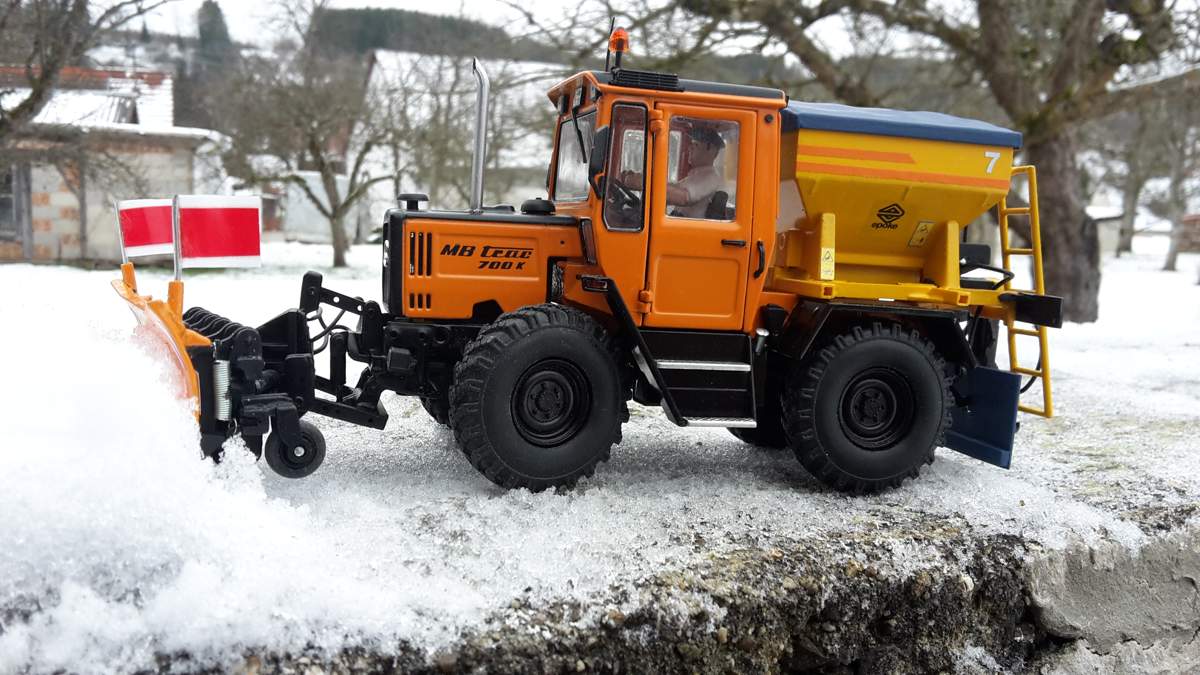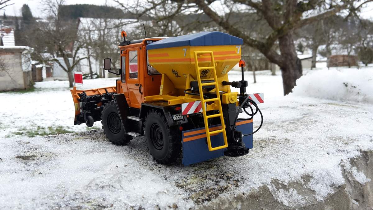 Der Streuer stammt von einem 1:43er Pegaso LKW und wurde modifiziert. Die Bereifung des Trac stammt von einem Joskin Güllefass auf den originalen Tracfelgen. Schneepflug von Wiking modifiziert und die FH wurde eingekürzt, damit der Pflug näher am Trac sitzt.