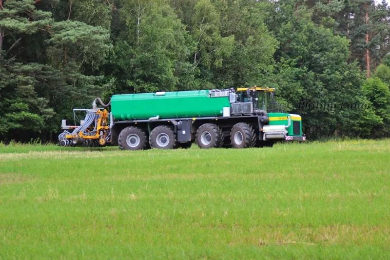 Na da wird aber fleißig diskutiert... naja letztendlich muss der Lohner wissen was er da für ein Gespann haben will...vom Gespann her kann man es mit einem Schlepper mit Tandem Fass vergleichen was aber vom Gewicht het wieder natürlich mehr ist...aber von der Ausbringleistung wieder besser... Zu den Rädern diese sind 800 mm breit und 30 Zoll im Durchmesser...