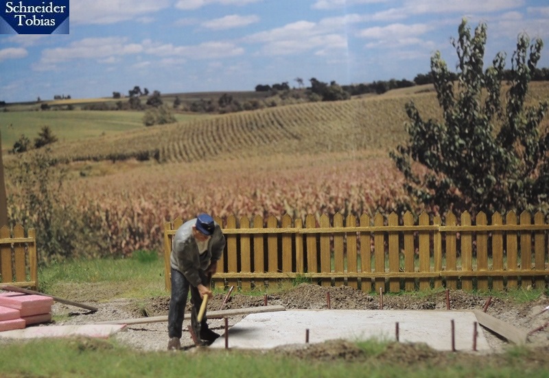 inzwischen wurde das Kleindiorama begrünt und erhielt den Unterbau für die Holzbündel. Beim Begrasen war zu beachten, dass einerseits Feldgras und andererseits Rasen (im Garten) dargestellt werden musste. Ich hoffe, man kann den Unterschied zwischen Feld- und Gartengras auf den Bilder ein bisschen erkennen. Ab- bzw. eingegrenzt wird der Gartenteil später noch durch einen Zaun.