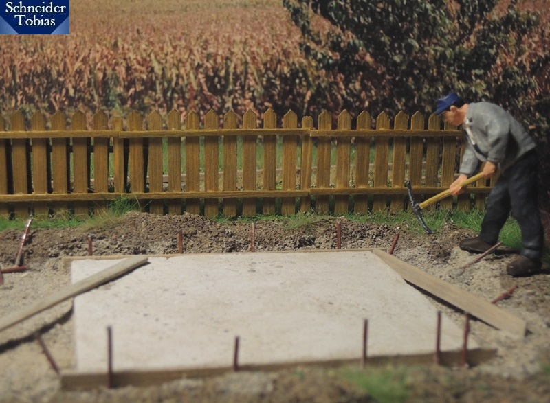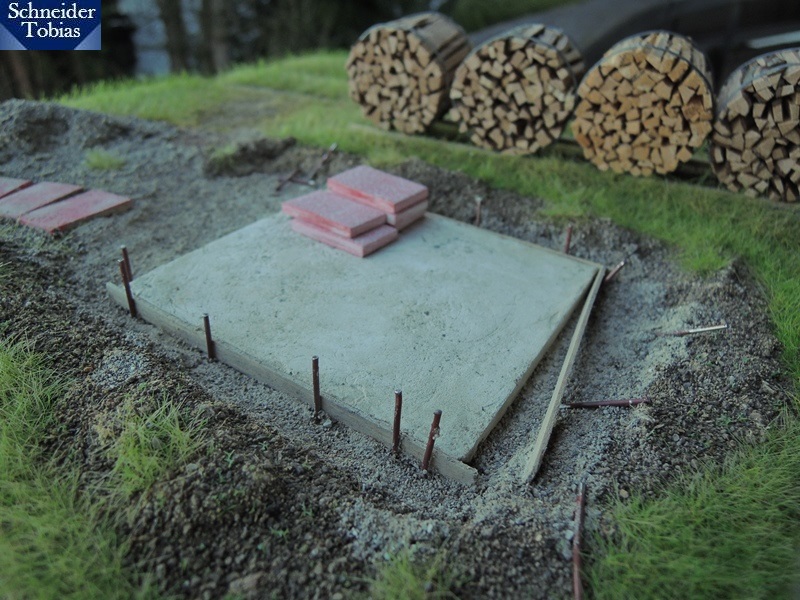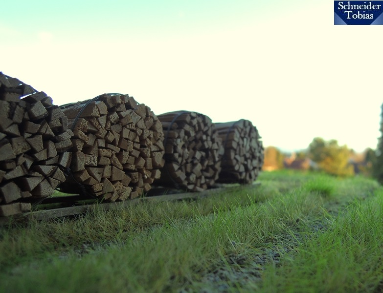 inzwischen wurde das Kleindiorama begrünt und erhielt den Unterbau für die Holzbündel. Beim Begrasen war zu beachten, dass einerseits Feldgras und andererseits Rasen (im Garten) dargestellt werden musste. Ich hoffe, man kann den Unterschied zwischen Feld- und Gartengras auf den Bilder ein bisschen erkennen. Ab- bzw. eingegrenzt wird der Gartenteil später noch durch einen Zaun.