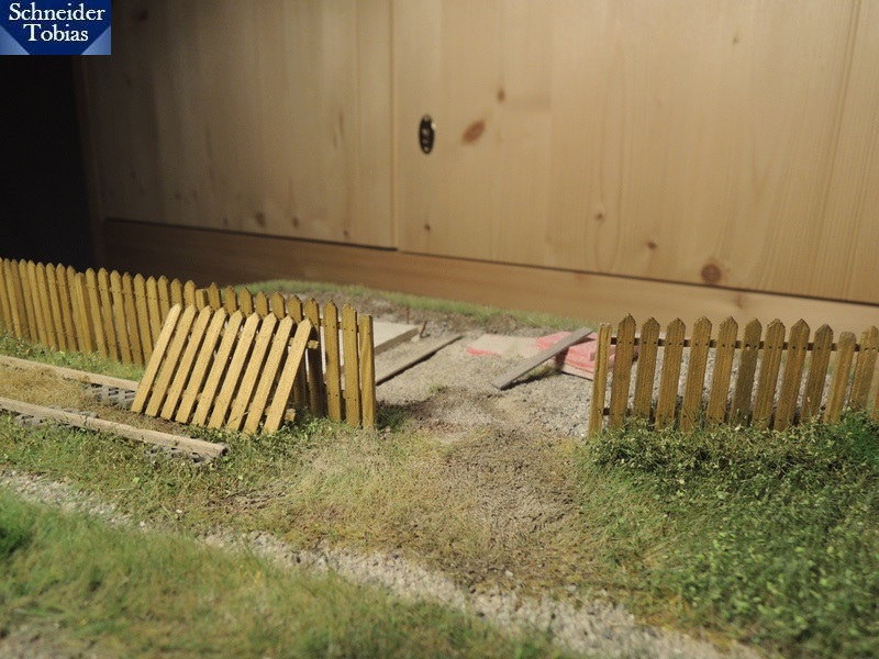 Heute kam der Zaun dann auf's Diorama. Daneben habe ich die Begrünung vervollständigt und teilweise angepasst.