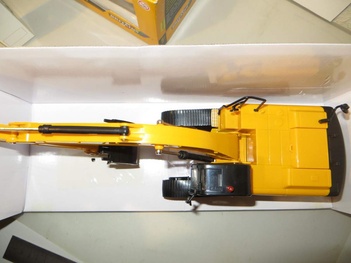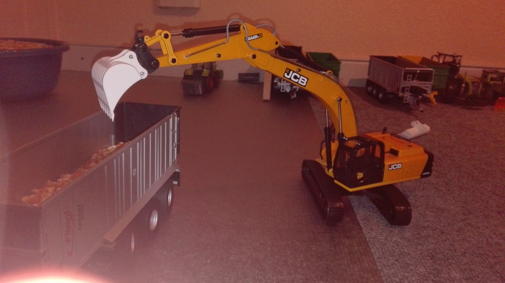 Der Bagger gefällt mir ganz gut und wird auch für Umbauer keine schlechte Basis sein. Das Untergestell besteht mehrheitlich aus Metall, der 360° drehbare Aufbau mit Ausleger mehrheitlich aus Kunststoff. In Verbindung mit den recht schwergängigen "Hydraulikzylindern", die auch Ladung gut halten würden, hat man allerdings einen doch fragilen Eindruck insbesondere des Auslegers.