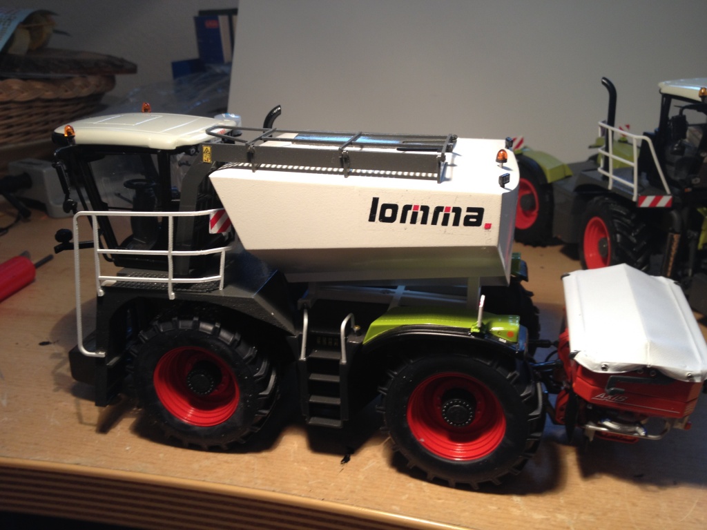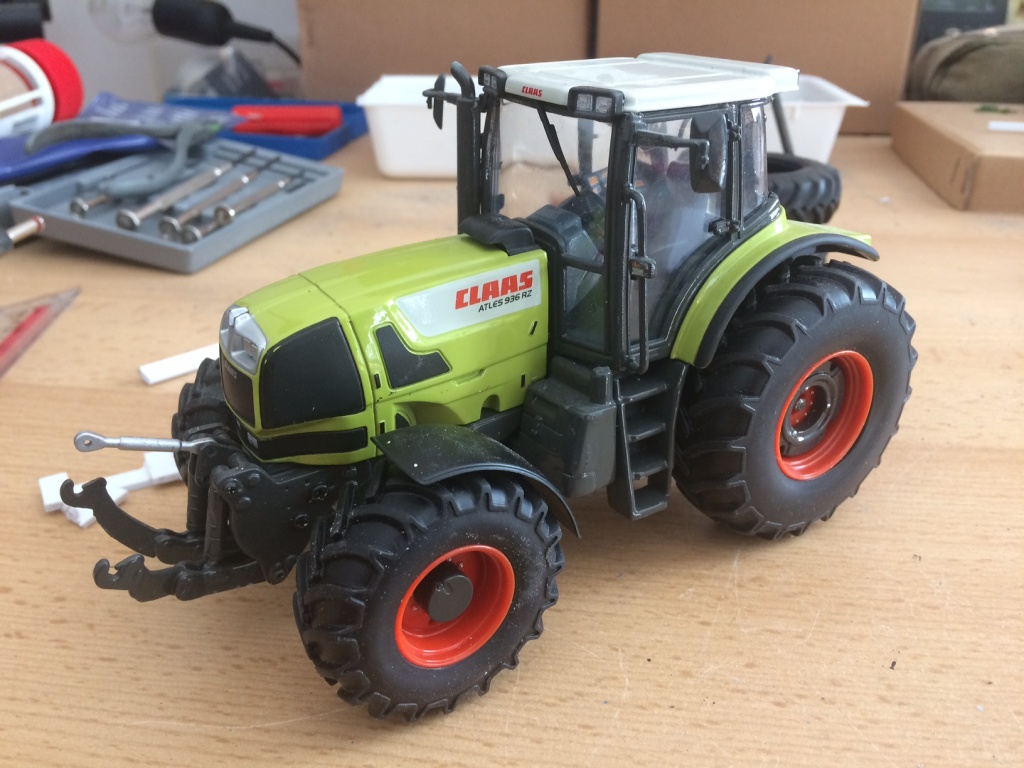Dann habe ich in den letzten Wochen ein paar Schnapper machen können (UH und Wiking sowie Norscot Claas Schlepper) und habe dann ein wenig umgebaut. Hier sind aktuell aber noch 2 Claas auf der Werkbank. Bereits fertig ist der UH Claas Ares 657 ATZ. Dieser hat eine neue Heckhydraulik (Artisan) und eine neue Lackierung in Originalfarbe erhalten. Auch der UH Claas Atles 936 RZ ist bereits fertig. Diesen habe ich ebenfalls neu lackiert, eine Wiking Heckhydraulik vom Axion 850 spendiert und auch ein paar vernünftige Reifen inklusive Achsschenkellenkung verpasst. Der dritte im Bunde ist der Norscot Axion 850. Aus meiner Sicht ein netter Schlepper, der allerdings durch falsche Rumpflackierung und die hässliche Bereifung sehr an Attraktivität einbüßt. Aber ehrlich gesagt ist der von ROS irgendwie auch nicht schicker... Deshalb hab ich kurzer Hand selbst angelegt