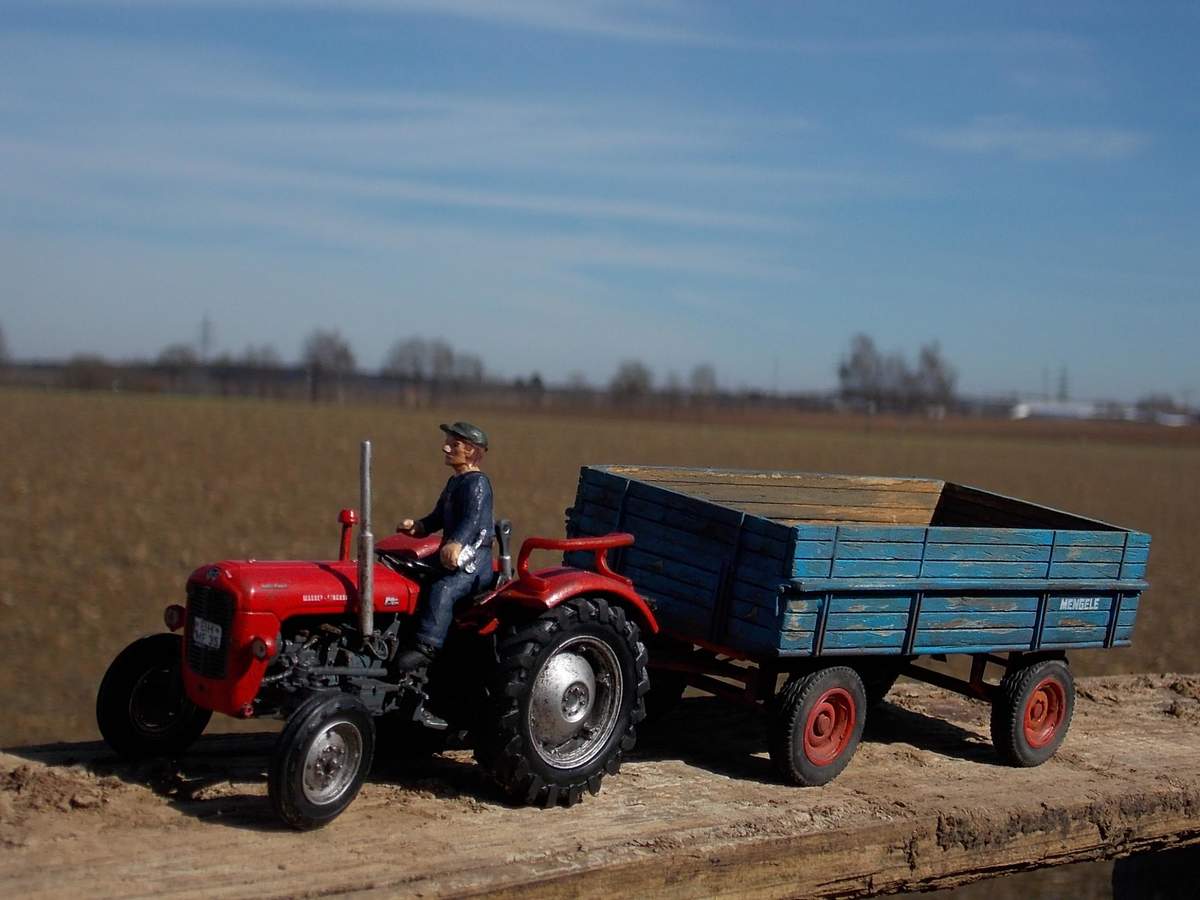 Gefällt mir, besonders die Alterung. Die Zuggabel des Hängers dürfte etwas länger sein, damit der Abstand zwischen Schlepper und Anhänger etwas authentischer wirkt.