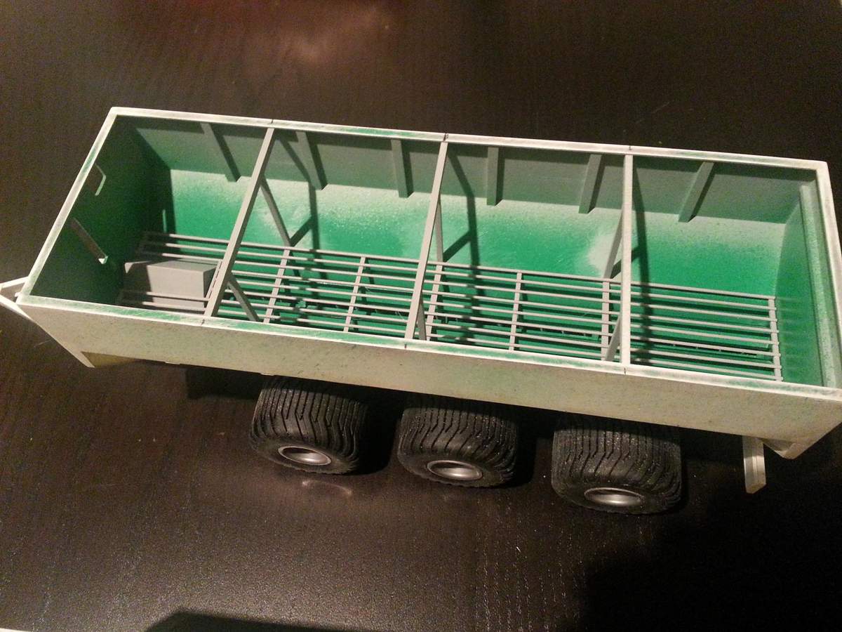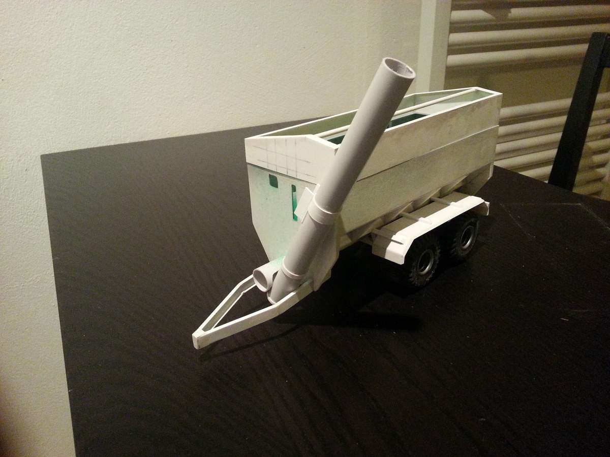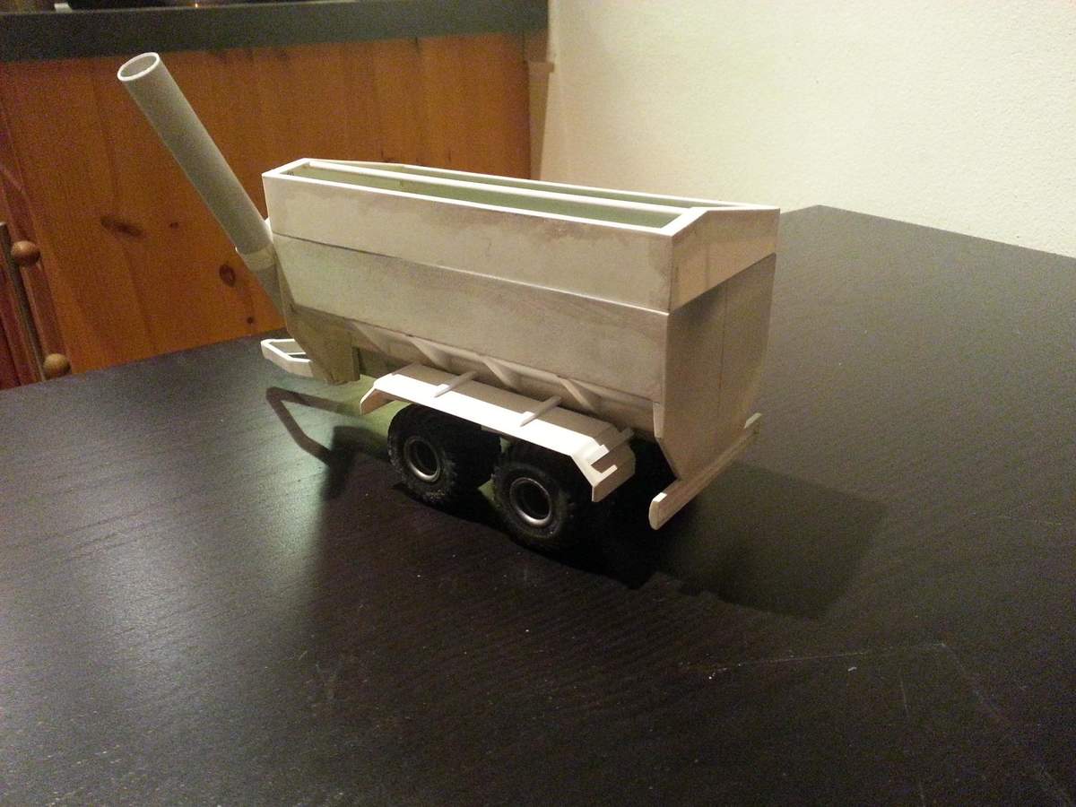 Und ein paar Bilder mit neuen Teilen. Die Teile sind allesamt noch nicht befestigt und alle nur lose draufgelegt. Die Kotflügel kommen noch ein Stück dichter an die Mulde dran, der Aufsatz bekommt noch die vorderen Fenster,und die angefangene Überladeschnecke ist auf dem Bild auch nur drangelegt..... noch ne Menge Arbeit, vor allem, wenn man alles mehrfach machen darf;)