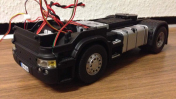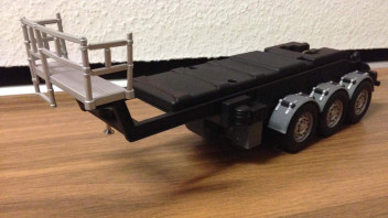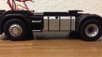 Alle Teile sind von Hand gefertigt. Die Einzelteile wurden verlötet und das Ganze verschliffen, danach noch lackiert (leider nicht ganz glatt...). Dann wurden am LKW Löcher gebohrt, in diese wurde dann die Stoßstange gesteckt und innen am Chassis verklebt.