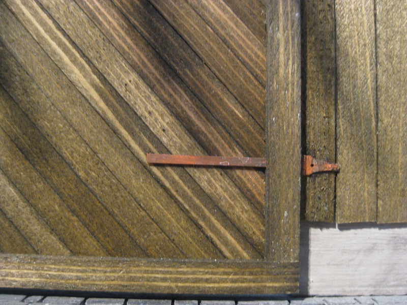 Ich habe kleine Scharniere von AeroNaut ins Holz eingelassen und diese auf der Holzverschalung vom Tor mit 0,5x2mm starken Kunststoffprofilen verlängertDas ganze davor schwarz eingefärbt und mit MIG Rostpigmenten gealtert - fertig;).... -