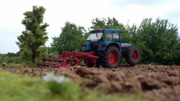 Diesmal handelt es sich um einen Eicher 3145 von Schuco den ich leicht umgebaut und gealtert habe. Der Grubber entstand aus Siku Teilen die ich neu zusammengefügt, lackiert und gealtert habe. -