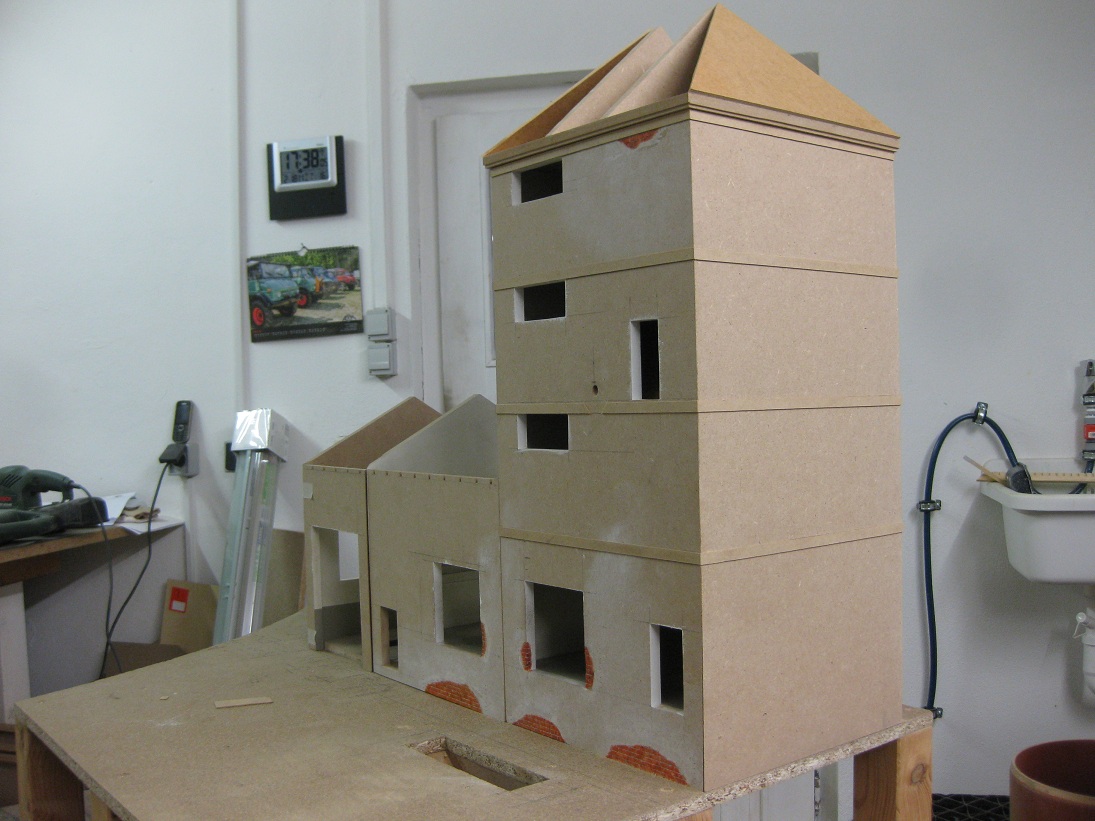 Ich bin gespannt, wie die Steine wirken, wenn die Wand verputzt ist. Mir schwebt ja noch immer ein verfallenes Lagerhaus mit Schienenanbindung vor. Dafür habe ich neben den Zeichnungen auch schon ein paar Probestücke gebaut. Abgebröckelten Putz und die darunter erscheinenden Mauersteine darzustellen, finde ich gar nicht so einfach.