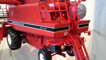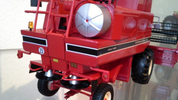 Der Drescher selbst ist auch zum größten Teil aus Metall. Eine Vielzahl an Details und Aufklebern machen diesen Drescher zu einer Augenweide. Die Aufstiegstreppen zur Kabine und hinten am Heck sind nach oben klappbar,