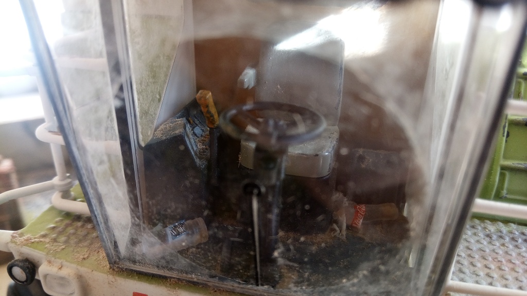 Die Rückwand habe ich einer meist mit Rauchern besetzten Kabine nachempfunden und möglichst scheckig gemacht. Das Fenster ist auch nur aufgemalt ( hat man beim Hersteller wohl vergessen) und lieber so als gar keins.