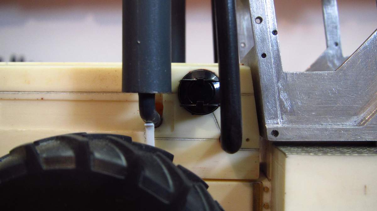 die Dieselleitungen und die Tankentlüftung unter den Kotflügeln nach innen Richtung Rahmen...... und in diesen Öffnungen verschwinden sie dann...! Durch das kleine Loch ganz rechts bekommt die Hydraulik