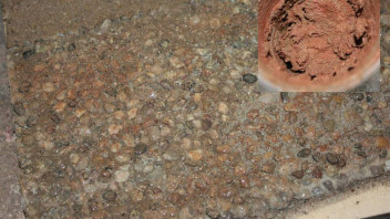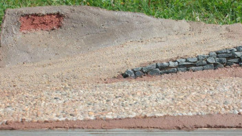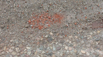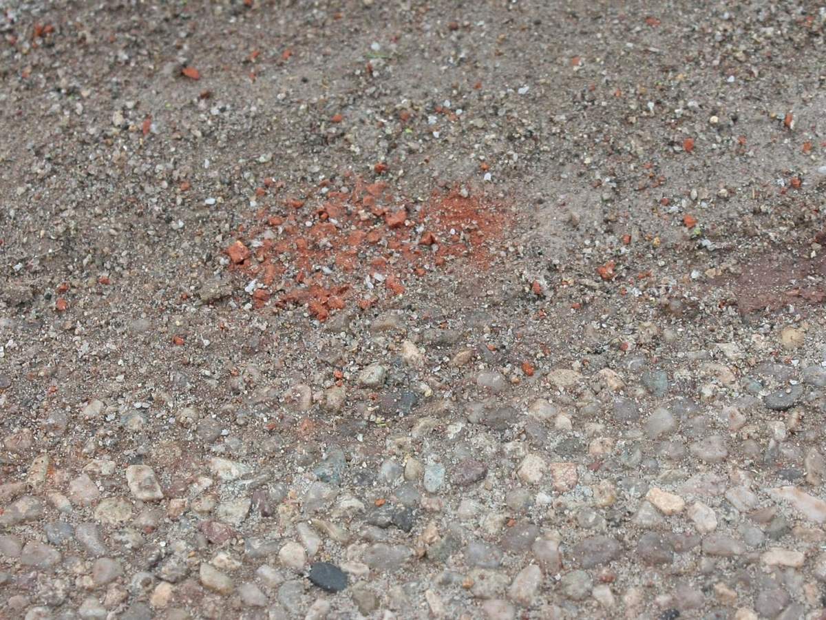 An der Einmündung wurde ein Schlagloch fachgerecht mit Ziegelschutt geflickt.