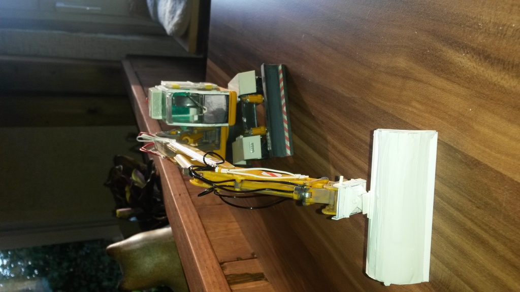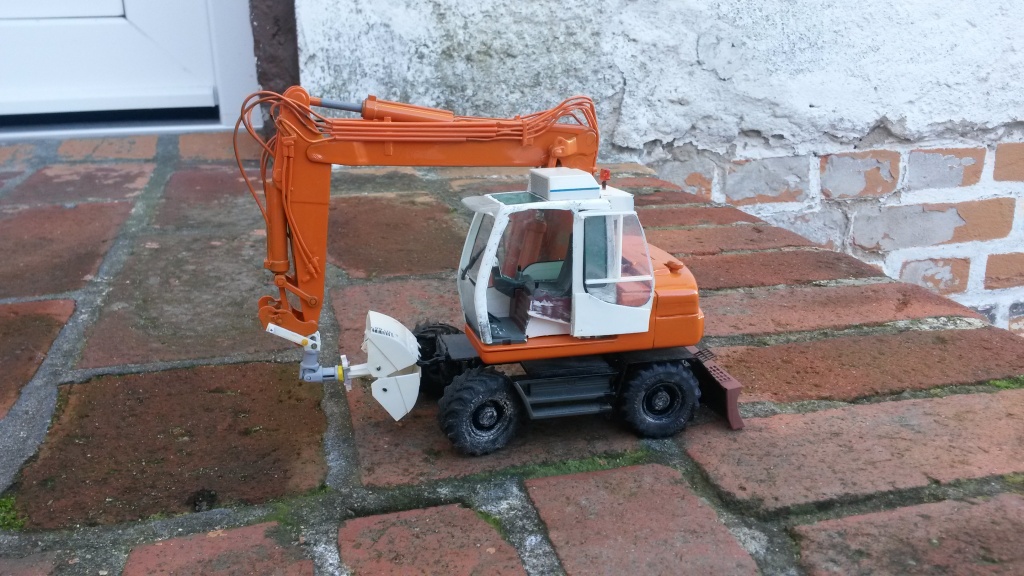 Ich finde den Umbau sehr gelungen besonders das Heck hast du sehr gut hinbekommen Die Farbe ist natürlich Geschmacksache, ausserdem finde ich die Hydraulikleitungen am Ausleger etwas zu kräftig. Sind die Hydraulikschläuche bei deinem Vorbild auch in dieser Farbe lackiert?