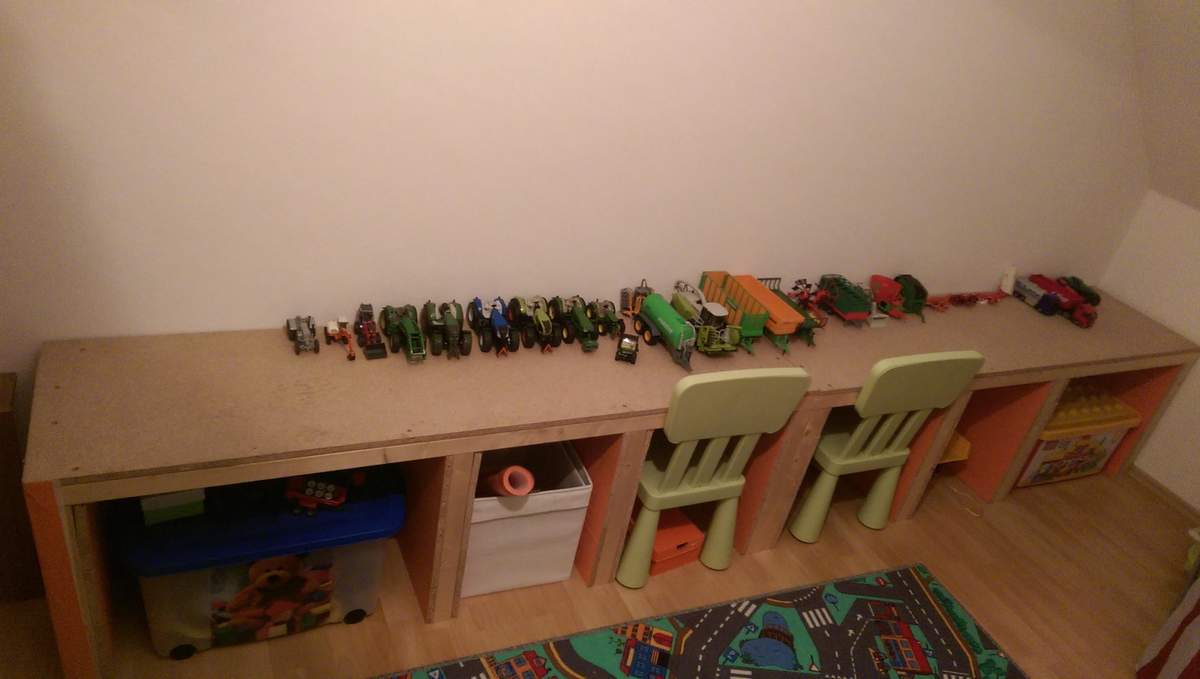 Unter die Platte sollen noch Stauräume für 2 Spielzeugkisten, 2 IKEA Würfelkisten und 2 Flächen mit Einlegeböden ihren Platz finden.