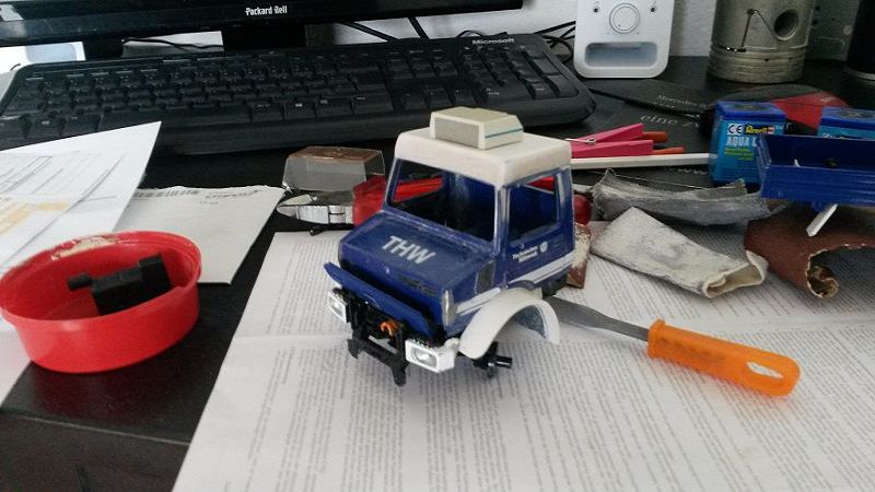 Bei Ebay konnte ich günstig einen Schuco Unimog ersteigern, dieser dient als Basis. Ist zwar die THW Version, aber da am Ende eh alles lackiert werden muss, war das egal