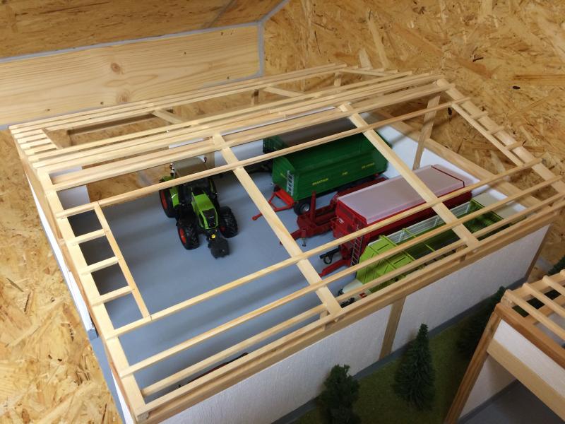 in den letzten Tagen ging es langsam vorwärts. Im Stall wurden die Boxen weiter aufgebaut, jetzt fehlen nur noch die Fronten mit den Türen. Die Maschinenhalle hat einen Teil vom Dach bekommen und die Werkstatt die restlichen Wände.
