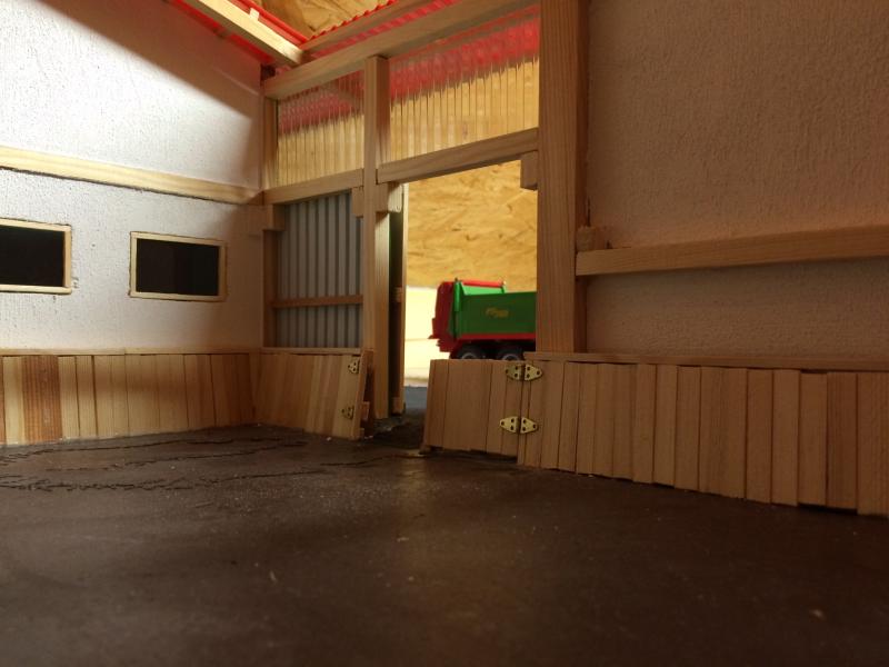 in den letzten Tagen ging es langsam vorwärts. Im Stall wurden die Boxen weiter aufgebaut, jetzt fehlen nur noch die Fronten mit den Türen. Die Maschinenhalle hat einen Teil vom Dach bekommen und die Werkstatt die restlichen Wände.