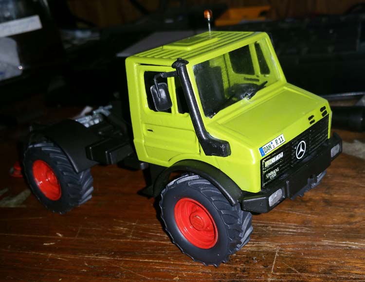 3. Willst du wirklich die Siku-HH dranlassen? Ich kann ja verstehen, dass man die Kompabilität behalten möchte, meiner Meinung nach ist die aber derart klobig, dass man eben sofort sieht, dass das ein Siku Unimog ist, was du sonst eigentlich schön verfeinert hast mit den Spiegeln usw.