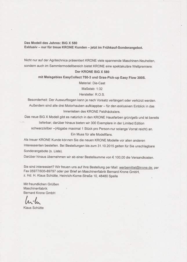 alle können bei Krone bestellen - Die Post ist lediglich an die heraus gegangen, die schon mal etwas bei Krone bestellt haben. Wie sollte Krone auch sonst an eure Adresse kommen? Die Preise sind die, die für alle jetzt und während der Messe gültig sind. Die älteren Modelle sind etwas runter gesetzt.