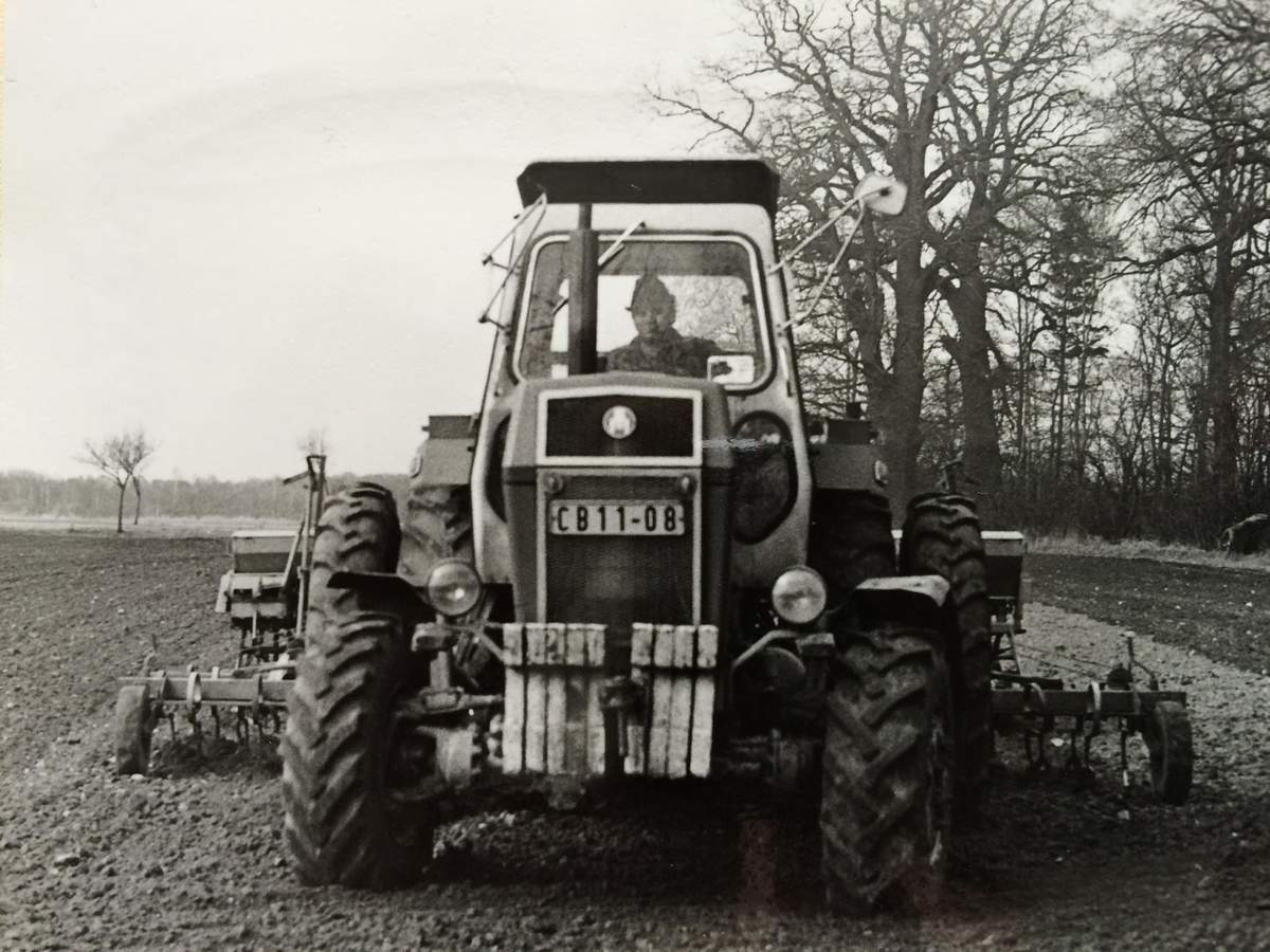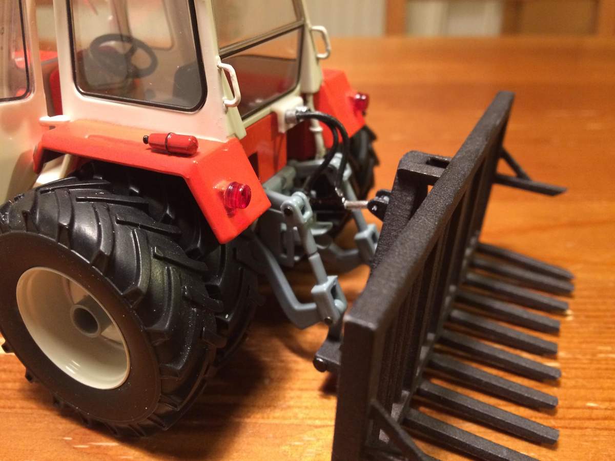 Also da ich damals nie einen grünen gesehen hatte (waren wohl für den Export oder Vorzeige Kombinate in Sachsen vorbehalten) hab ich dat Dingen zerlegt und orginal ZT rot aus der DDR Dose (hatte Vaddern noch) in die Sprühpistole gemacht. Dann ein paar Löcher in die Aufnahme und die TK Customs Silogabel ran. Die ist auch ein bißchen fett weil für'n K700 gedacht - aber die 3m Version geht noch so.
