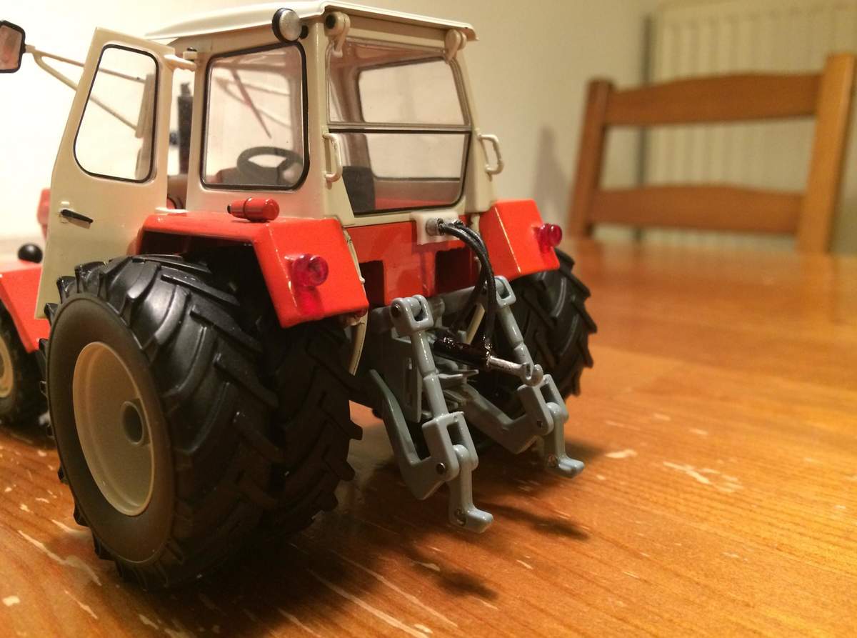 Und zwar den ZT 303. So'n Teil hat mein Opa schon gefahren, mein Vater hat auf'm KfL (Kreisbetrieb für Landtechnik) gearbeitet -sprich ich bin da vorbelastet;). Nachdem ich den 300'er und den blauen 303'er von Schuco verpasst hatte, habe ich mir die grüne Mühle mit Zwillingsbereifung besorgt. Vorweg, das Modell an sich ist schon ziehmlich semipro. Vorderräder zu schmal, Zwillingsbereifung nicht orginal, Kabine stimmt nicht ganz und das ganze Gebamsel hintendran (Aufnahme Ackerschiene) zu weit nach hinten raus etc.. Aber es gibt halt nüscht besseres auf'm Markt - man erkennt das es ein ZT ist:D.