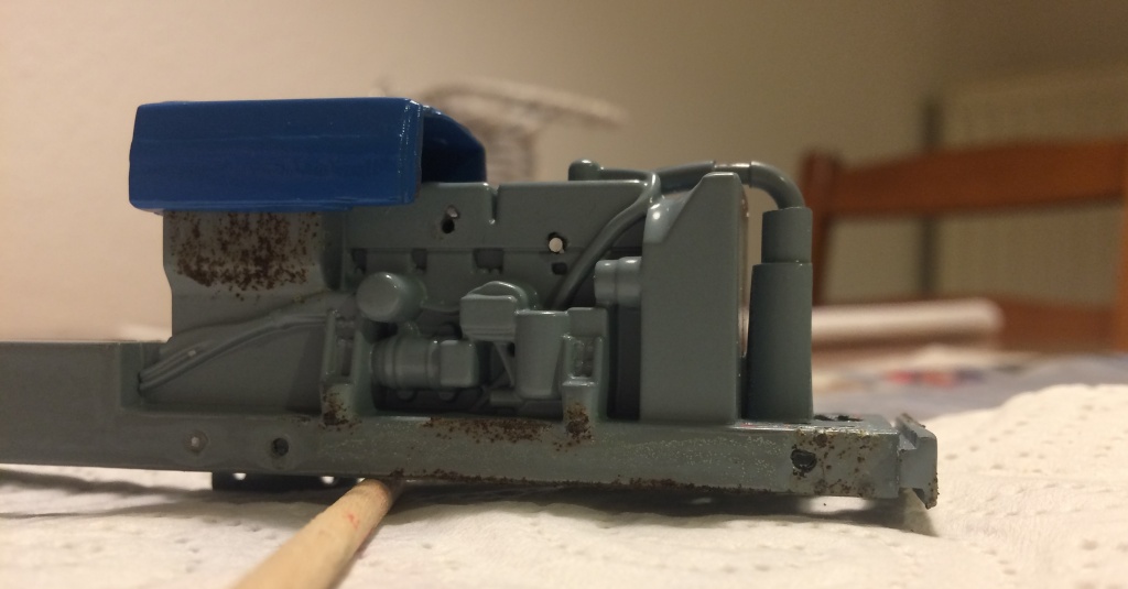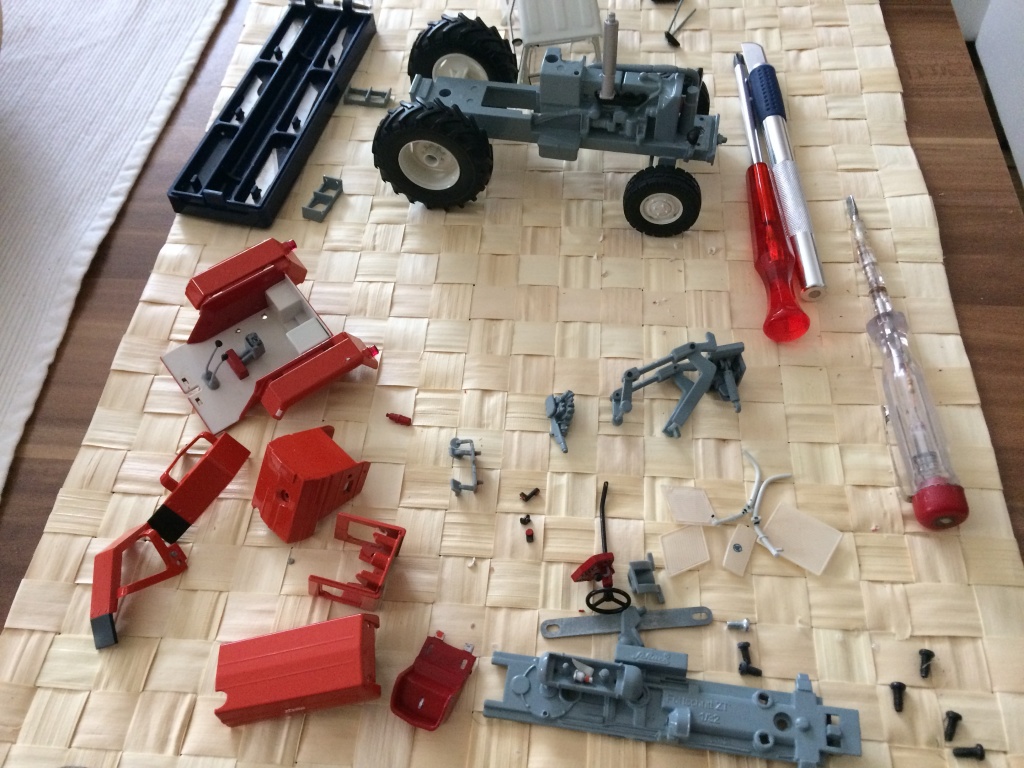 ich hab mal mit dem 300 C weiter gemacht. Die Haube hat erstmal den passenden Schriftzug bekommen. Das Hintere Teil (Tankabdeckung, Seitenbleche) hab ich mal ein bißchen vorab bearbeitet, so das ein Beulen -, Bauernblind gestrichen -, es gab gerade nichts besseres Effekt vorhanden ist. Die Farbgebung ist auch leicht anders, so das man später evtl. erkennt - das hier ist ein Teil von einem Teilespender. Zudem habe ich das rechte Seitenblech entfernt. Das ist in die Furche gefallen und wurde mit untergepflügt.