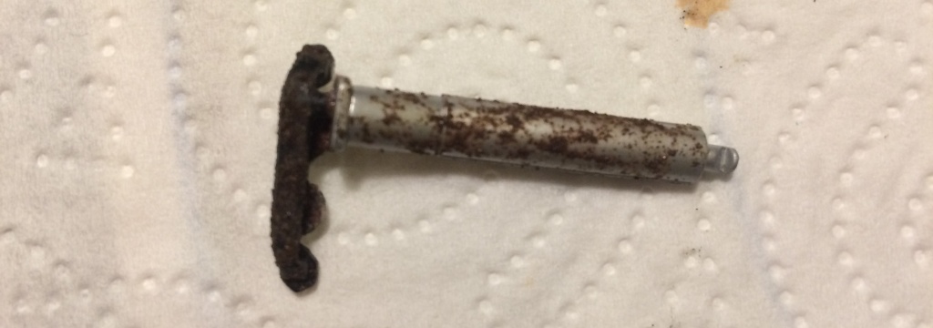 Dann zum Grundrahmen. Den habe ich mit 600'er Nassschleifpapier erstmal gemattet + einige stellen bis aufs Metall runter geschliffen. Dann habe ich mit 2 Komponeten Rost Set (Eisenoxid und Essig-Salz Mische) die runtergeschliffenen Stellen behandelt (es oxidiert aktuell immer noch). Auch der Tank bekommt erstmal "Grundrost". Am Ende wird hier noch ein bißchen geschliffen und mit Pikmentpulver verfeinert. Ach so Auspuff und Krümmer haben auch gleich 'ne Ladung bekommen.