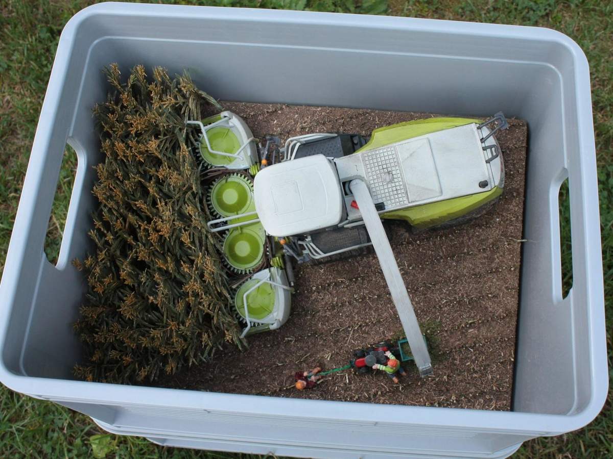 möglich nach unten geneigt werden konnte.Am Schneidwerk habe ich ein paar leichte Farbabnutzungen angebracht und zwei Pflanzen eingefädelt.