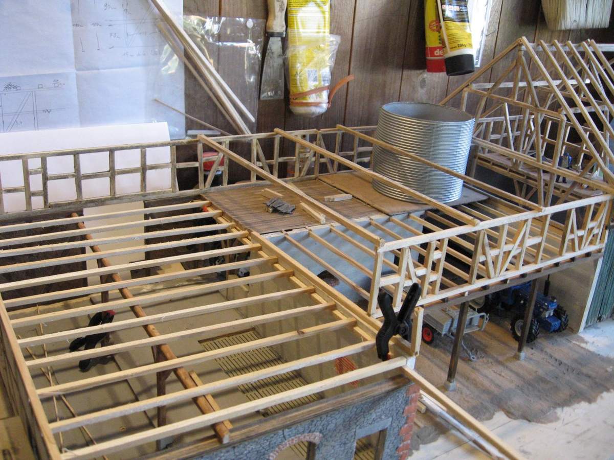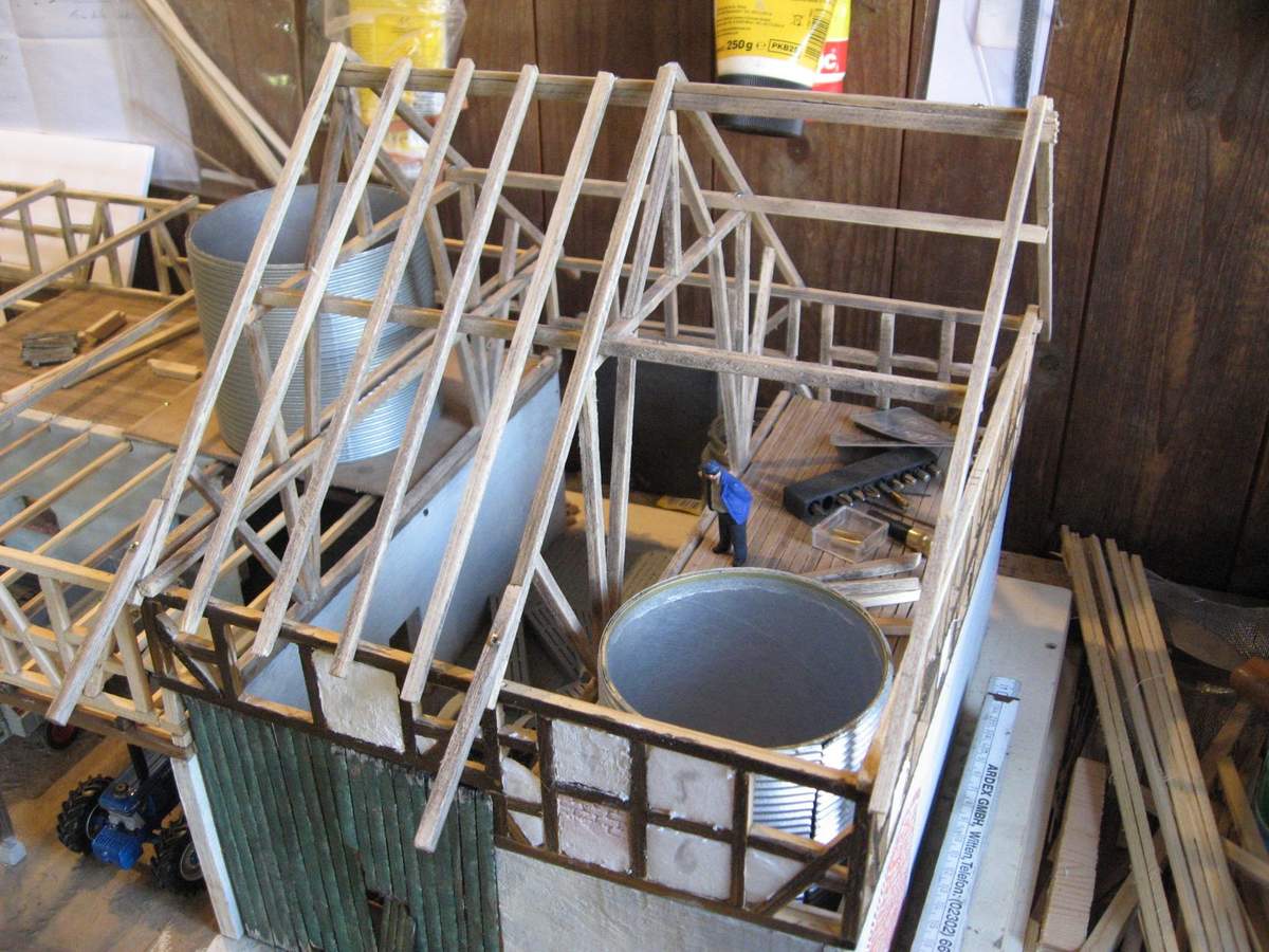 Die Gereitesilos stehen schon an ihrem Platz, der DAchstuhl wurde angefangen, hier und da wurden Bretter verlegt:
