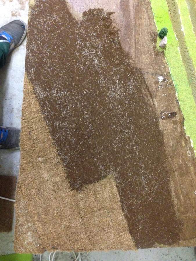 Bei der Darstellung von Erde würde ich keinen Kaffee, sondern direkt echte Erde nehmen (getrocknet, gesiebt). Diese wirkt - logischerweise - natürlich und lässt sich meiner Erfahrung nach auch super verarbeiten. Daneben frage ich mich, ob du die Platte noch erweiterst. Für einen Traktor vor dem bereits postierten Gerät ist ja etwas wenig Platz.