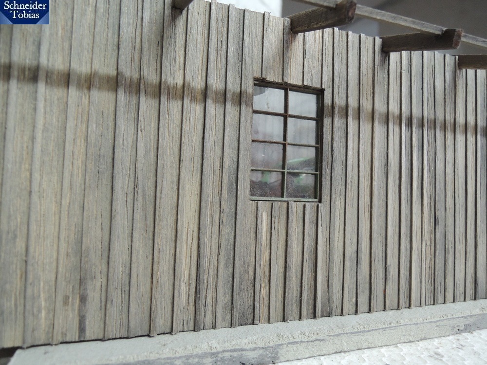 Die Bodenplanken sind aus Eisstäbchen entstanden, bei denen ich die typische seitliche Fase weggenommen habe. Ich finde, sie haben eine passende Stärke und gehen mit ihrer Maserung gut als kräftige Lärchenbretter durch.